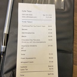 We first ordered take-out from Cafe Tayla a few months back and were hooked! My husband and son have been to Cafe Talya a few times since after hockey practice at Bayonne HS and raved each time about it. So finally I got to sit down to this most excellent food for myself this past weekend. I ordered the original French toast with strawberries and it did not disappoint! So light with just the right touch of cinnamon. Bacon I ordered was crisp and delicious, not greasy at all. My son devoured two orders of silver dollar pancakes and my husband enjoyed his burger and fries. The cafe is small but cozy and inviting. The servers are so friendly and accommodating. We cannot wait to go back. Oh, and the prices are just right too!
